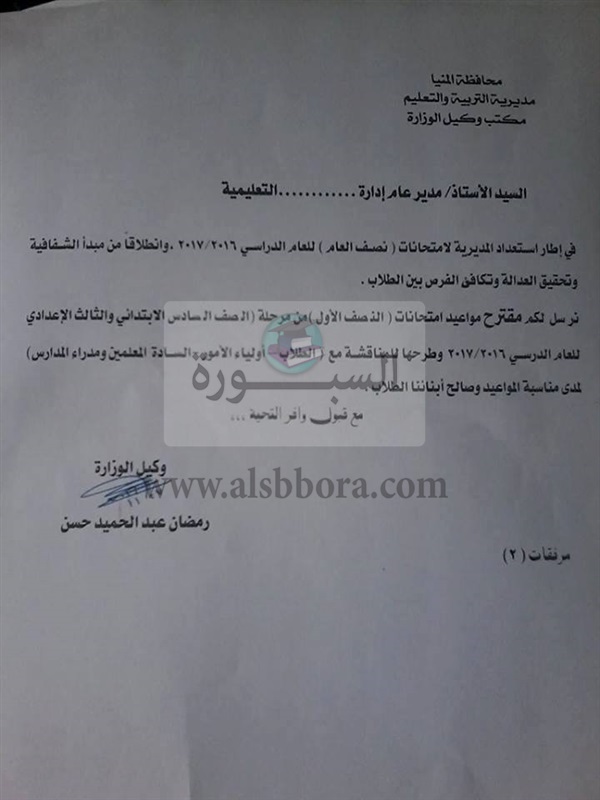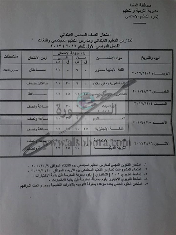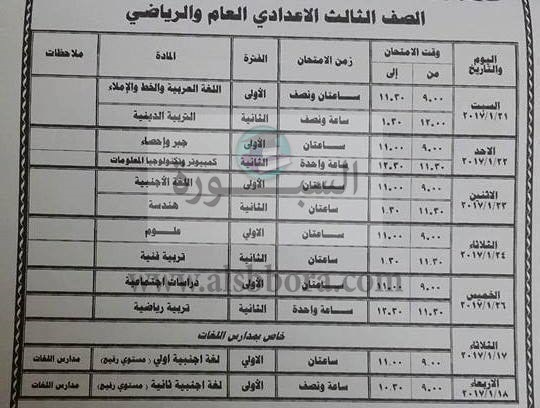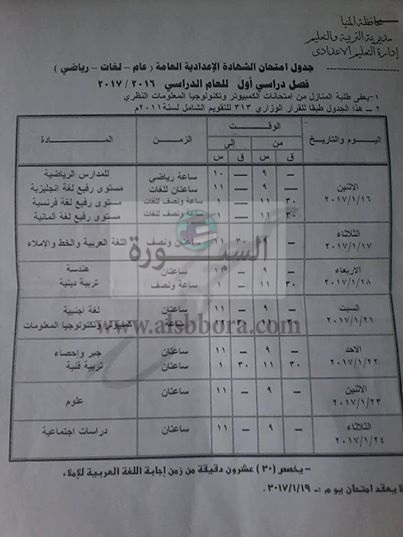 وكما طرحت محافظة المنيا جداول مقترحة لبدء الاختبارات للشهادات الابتدائية والاعدادية على ان تبدأ امتحانات الشهادة الابتدائية يوم 11 يناير 2017 الى يوم 16 يناير 2017 ، وكذلك يليها امتحانات الشهادة الاعدادية التى تبدا يوم 16 يناير 2017 وتنتهى يوم 24 يناير 2017 وفقا للجداول المقترحة المرفقة .