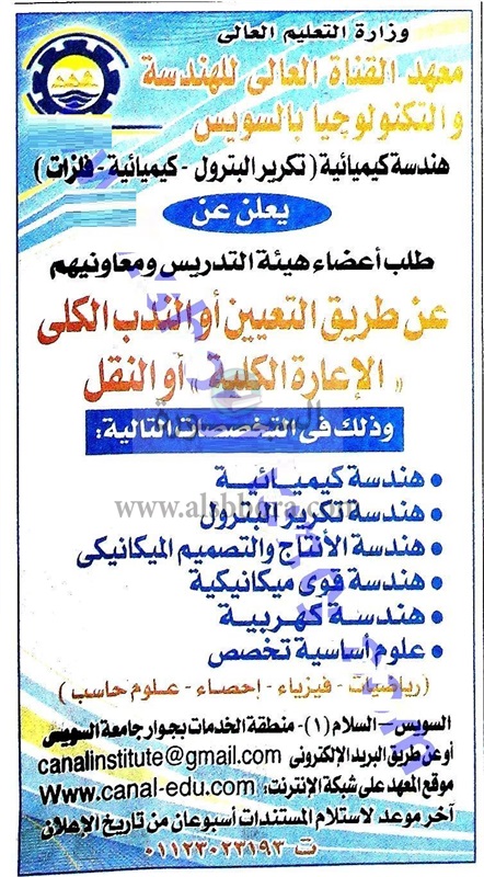 يعلن معهد القناة العالي عن وظائف جديدة لأعضاء هيئة التدريس وذلك وفقا لنص الإعلان التالي: