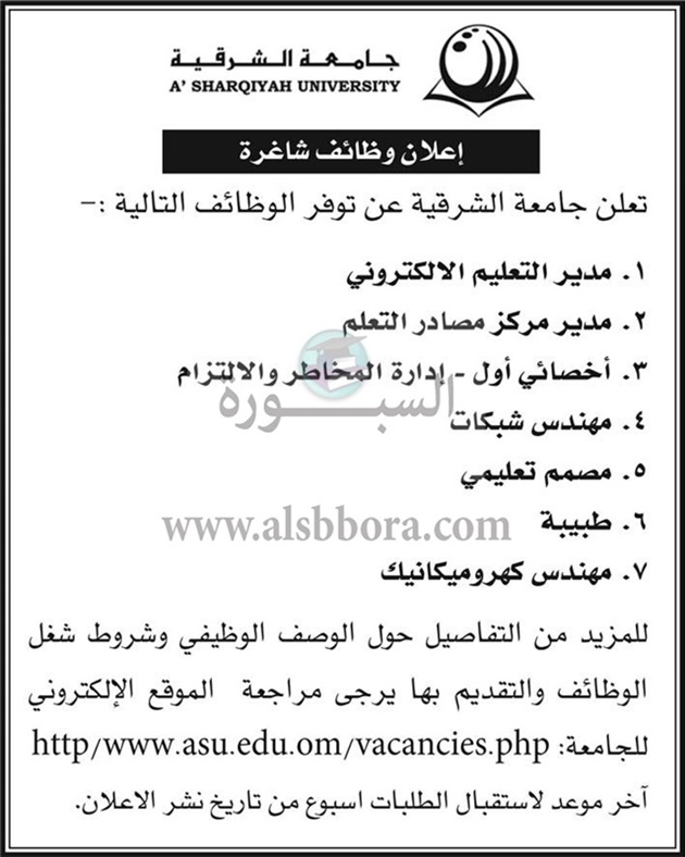 تعلن جامعة الشرقية بسلطنة عمان عن حاجتها الى وظائف شاغرة وعلى الراغبين فى التقدم التواصل عبر موقع الجامعة والرابط المنشور فى الاعلان التالى: