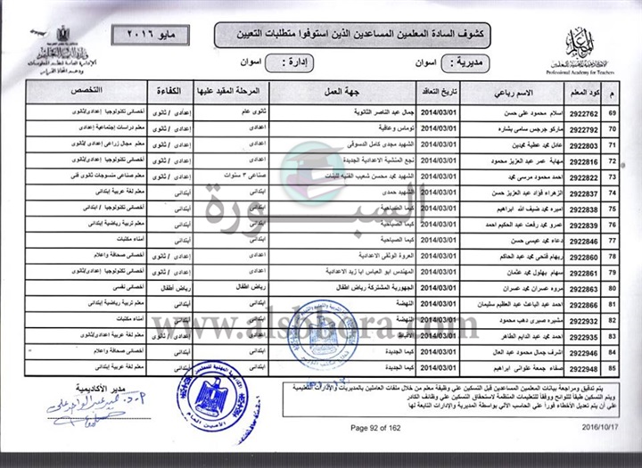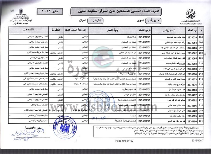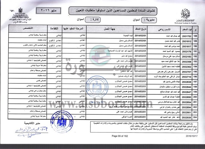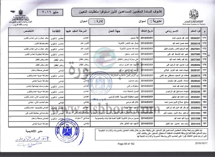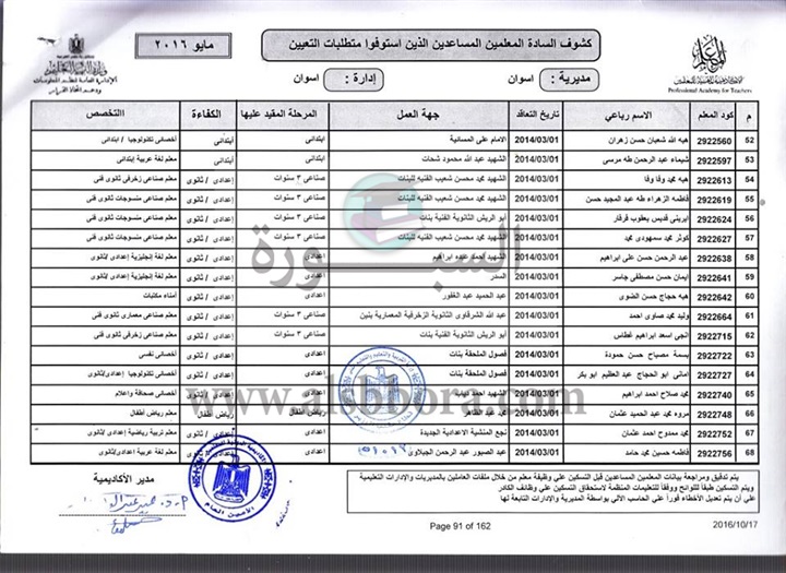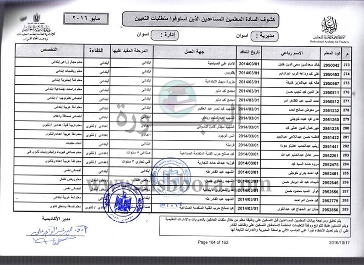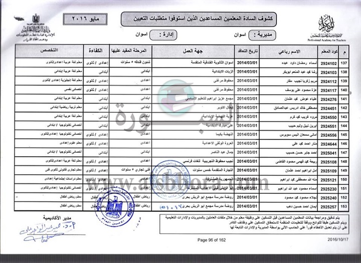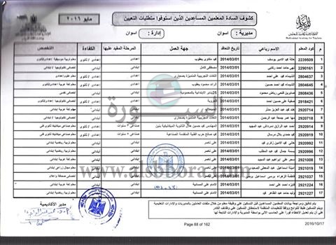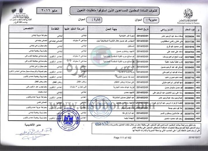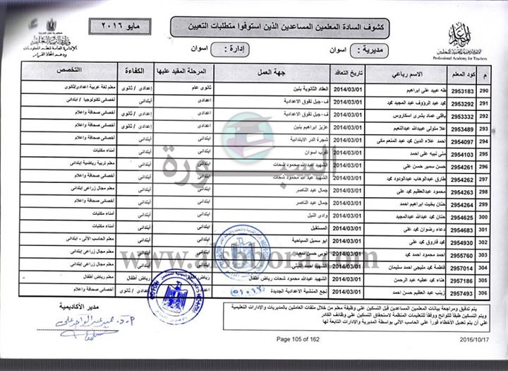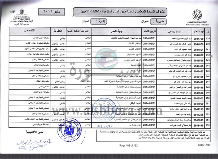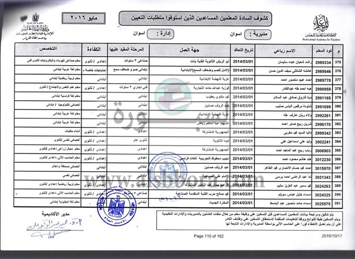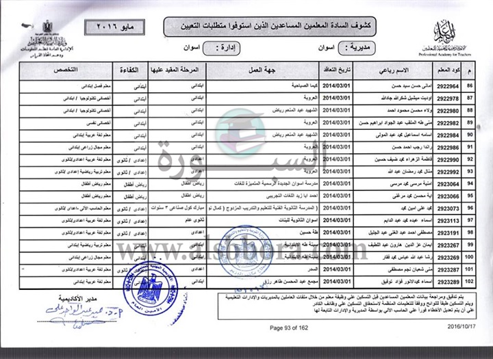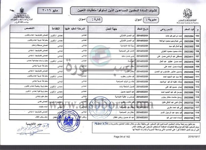 ينشر موقع السبورة كشوف أسماء المعلمين المساعدين بمحافظة اسوان والمخاطبين بقرار المحافظ رقم 288 والخاص بقرار الوزير رقم 355 لسنة 2016 ، والذين سيتم تسكينهم على وظيفة معلم وما يعادلها.