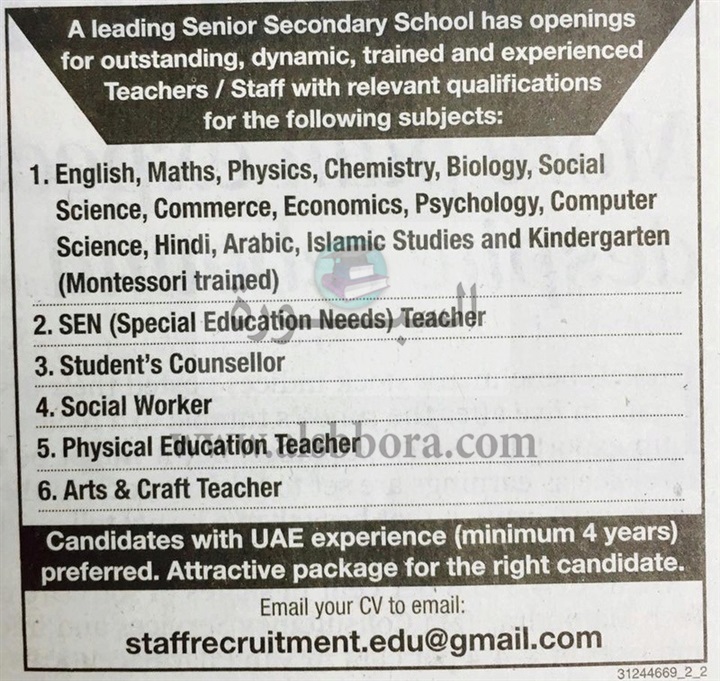 تعلن احدى الجهات التعليمية الكبرى بدولة الامارات عن حاجتها الى معلمين ومعلمات فى جميع التخصصات، وعلى الراغبين فى التقدم ارسال السيرة الذاتية عبر الاعلان المنشور أدنى الخبر.
