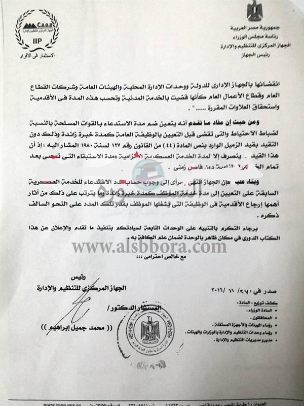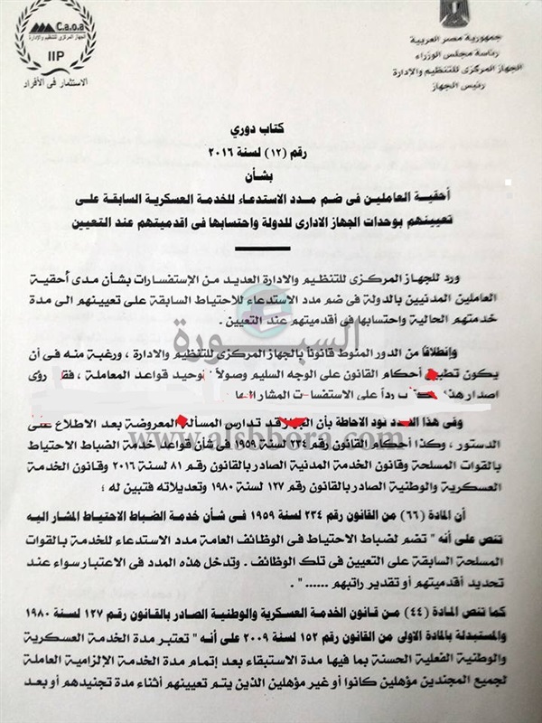 اصدر الجهاز المركزى للتنظيم والادارة الكتاب الدوري للجهاز رقم 12 لسنة 2016 بشأن أحقية العاملين في ضم مدد الاستدعاء للخدمة العسكرية السابقة على تعيينهم بوحدات الجهاز الإداري للدولة واحتسابها في أقدميتهم عند التعيين.