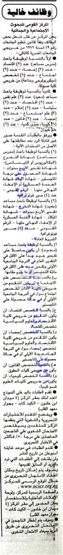 يعلن المركز القومي للبحوث عن وظائف جديدة لأعضاء هيئة التدريس "من معيد إلي أستاذ" وذلك وفقا لنص الإعلان التالي: