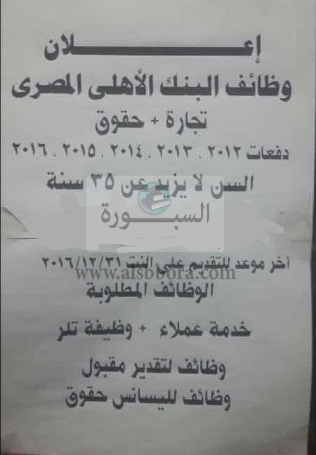اعلن البنك الاهلى المصرى عن فتح باب التقدم للالتحاق باختبارات التعيين بالبنك من الحاصلين على مؤهلات عليا للدفعات من 2012 الى 2016 وفقا للتخصصات المطلوبة والدفعات التى يحددها البنك فى الاعلان الرسمى له على ان يكون التقدم لتلك الاختبارات الكترونيا على الانترنت وفقا للتخصصات فى الاعلان التالى :