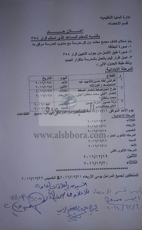 طالبت ادارة المنيا التعليمية "قسم الاحصاء" مندوب كل مدرسة بتسليم كشف مجمع معتمد بشأن المعلمين المساعدين والمرقين لدرجة معلم والصادر بشأنهم قرار رقم 354، مرفق به الآتى
