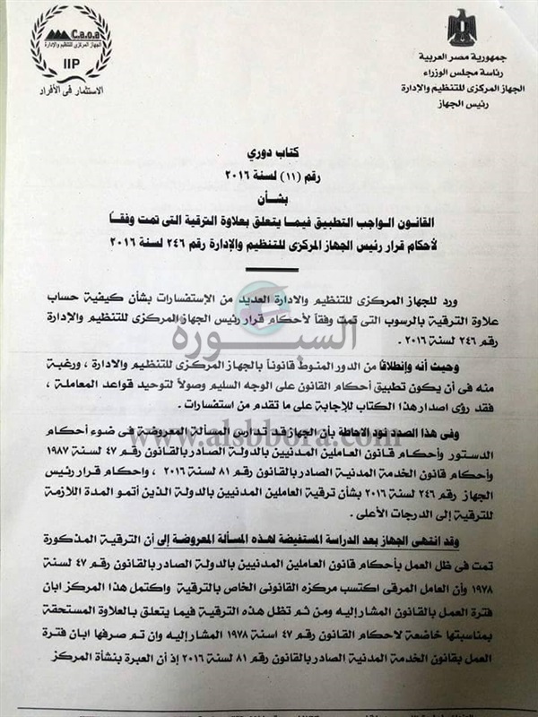 وجاءت الاجابة من قبل الحسينى محمد منصور الجعفرى بالتالى: "أولا بالنسبة لعلاوة الترقية الجهاز المركزي للتنظيم والإدارة حسم الأمر في ذلك بالنسبة للسادة المرقين اعتباراً من 1-7-2016م بقرار رئيس الجهاز المركزي للتنظيم والادارة رقم 246 لسنة 2016م بأن جعلها بنفس فئة العلاوة الدورية للدرجة لأنها الترقية صدرت في ظل أحكام القانون رقم 47 لسنة 1978م وتعديلاته"