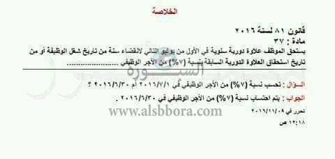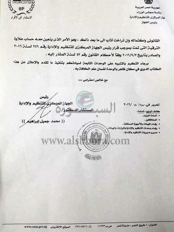 وتابع "أما العلاوة السنوية 7% فتحسب على الأجر الوظيفي بعد إضافة علاوة الترقية للمرقين في 1-7-2016م بقرار رئيس الجهاز المركزي للتنظيم والادارة رقم 246 لسنة 2016م".