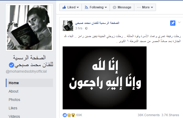 "صبحى" ينعى زوجته بكلمات مؤثرة على صفحته الشخصية
