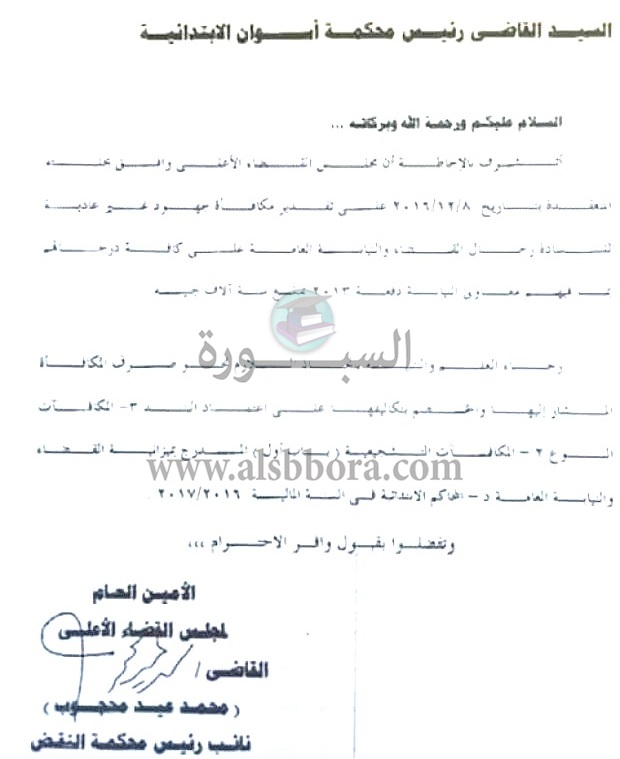 كان الأمين العام لمجلس القضاء الأعلى محمد عيد محجوب، ارسل خطاب موجه إلى محكمة أسوان الابتدائية، والذي تضمن التنبيه باتخاذ ما يلزم نحو صرف المبلغ المشار إليه والخصم بتكاليفها على اعتماد البند 3 والمكافآت التشجيعية المدرج بميزانية النيابة العامة والمحاكم الابتدائية في السنة المالية 2016/2017.
