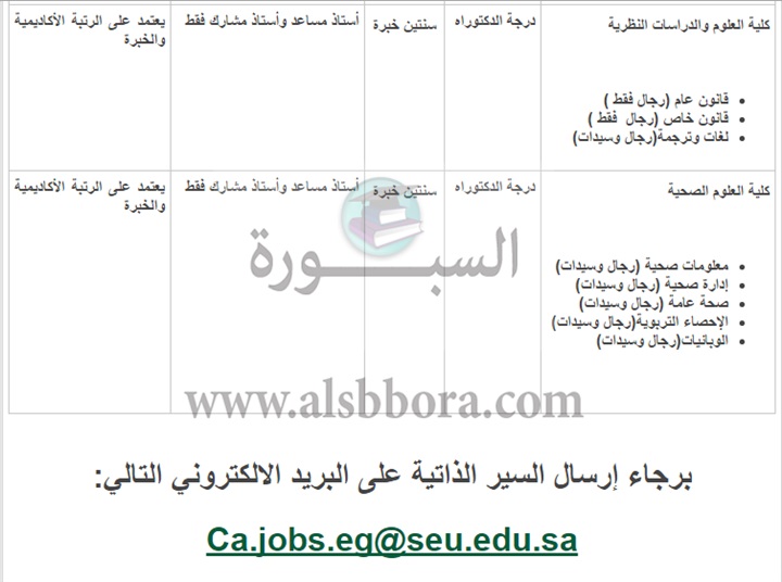 تعلن الجامعة الالكترونية عن حاجتها للتعاقد مع أعضاء هيئة التدريس من حملة الدكتوراه برتبة ( أستاذ مساعد , أستاذ مشارك , أستاذ ) وذلك للعمل في السنة التحضيرية وكلية العلوم الإدارية وكلية العلوم والدراسات النظرية وكلية العلوم الصحية وذلك حسب الاحتياجات التالية: