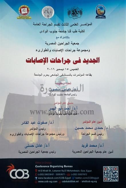 تنظم جامعة جنوب الوادي المؤتمر العلمي الثالث لقسم الجراحة العامة بكلية طب قنا والمستشفى الجامعي تحت رعاية الدكتور عباس منصور رئيس الجامعة بالتعاون مع جمعية الجراحين المصرية ومجموعة جراحات الإصابات والطوارئ وذلك يوم الخميس الموافق 15 ديسمبر الجاري.