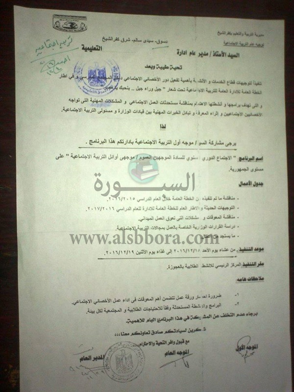 ينشر موقع السبورة الفاكس الخاص بشأن اجتماع موجهى أوائل التربية الاجتماعية بشأن أهمية دور تفعيل الاخصائيين الاجتماعيين.