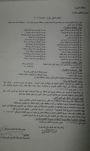 كانت مديرية التربيه والتعليم بمحافظة مطروح اعلنت عن 500 وظيفه معلم واخصائى لعدد من التخصصات والتى ينتهى التقديم عليها غدا الخميس الموافق 2016/12/15