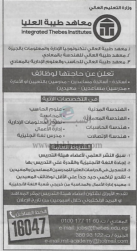 معاهد طيبة العليا التابعة لوازة التعليم العالى عن حاجتها لتعيين عدد من اعضاء