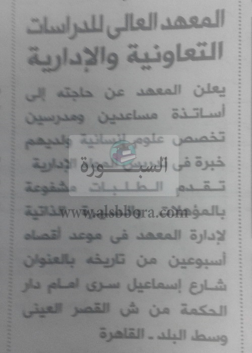 عاجل.. المعهد العالى للدارسات التعاونية الادارية يعلن عن حاجته الى أعضاء هيئة التدريس.. ننشر نص الاعلان