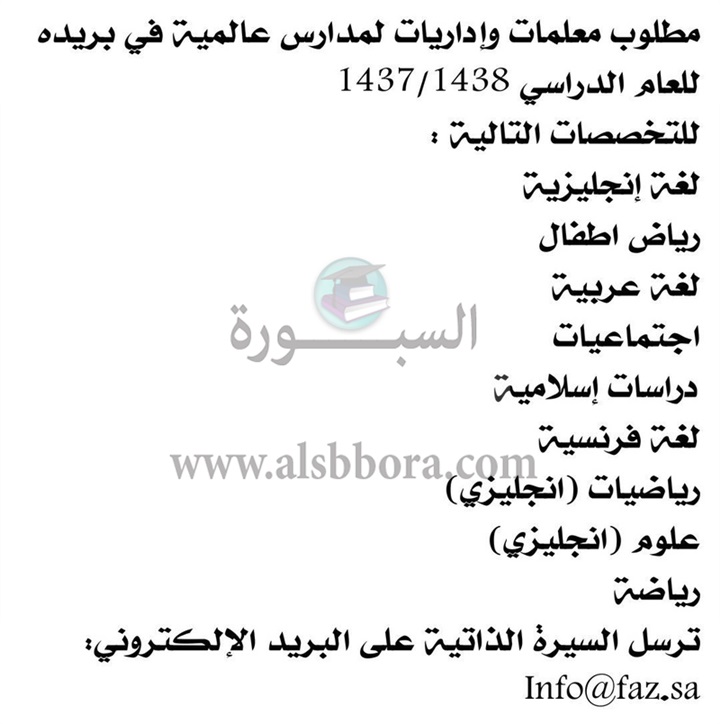 تعلن احدى المدارس الكبرى بمدينة بريدة بالمملكة العربية السعودية عن حاجتها الى معلمات فى جميع التخصصات، وعلى الراغبين فى التقدم ارسال السيرة الذاتية على الايميل المنشور فى الاعلان التالى: