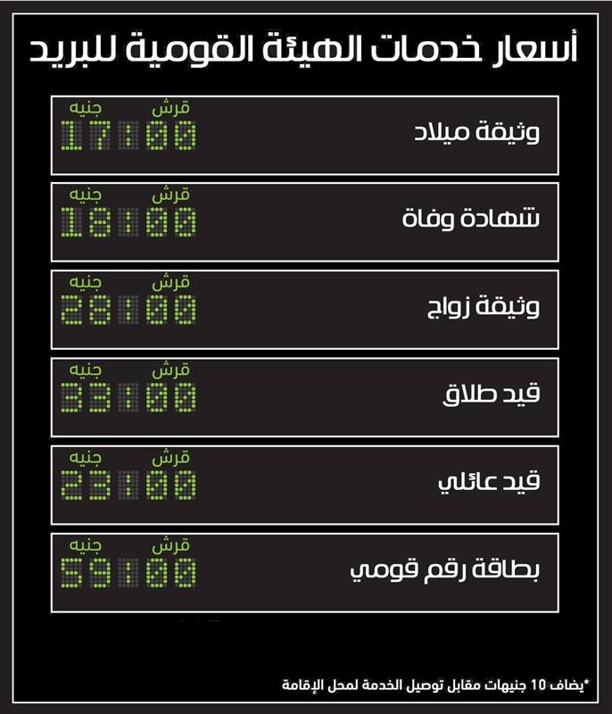 وصرحت الهيئة، في بيان اليوم، إن الخدمات التى تقدمها الهيئة تشمل شهادات الميلاد والقيد العائلى ووثائق الزواج والطلاق وشهادات الوفاة وتجديد بطاقات الرقم القومى، وفقا للاسعار التالية