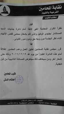 أصدرت نقابة المحامين الفرعية بالفيوم، برئاسة هشام الدش، نقيب المحامين بالمحافظة، بيانًا أكدت فيه بتعليق العمل أمام الدائرة الثالثة بمحكمة جنايات الفيوم، اعتراضًا على حجز المحامى وإدخاله قفص الاتهام دون وجه حق، وفق ما جاء فى بيان النقابة