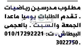 تعلن مدرسة خاصة في الإسكندرية عن حاجتها للتعاقد مع معلمين وذلك وفقا لنص الإعلان التالي: