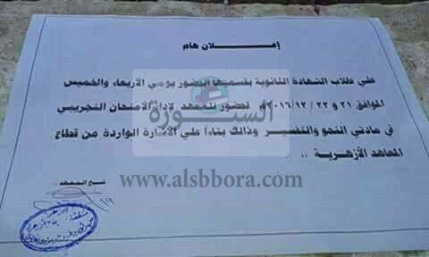 أعلن قطاع المعاهد الأزهرية فى بيان هام أنه على طلاب الثانوية الأزهرية بقسميها "الأدبى والعلمى" التوجه الى المعاهد الأزهرية المقيدين فيها يومى الأربعاء والخميس المقبلين الموافقين 21 و22 ديسمبر لآداء امتحان تجريبى فى مادتى النحو والتفسير.