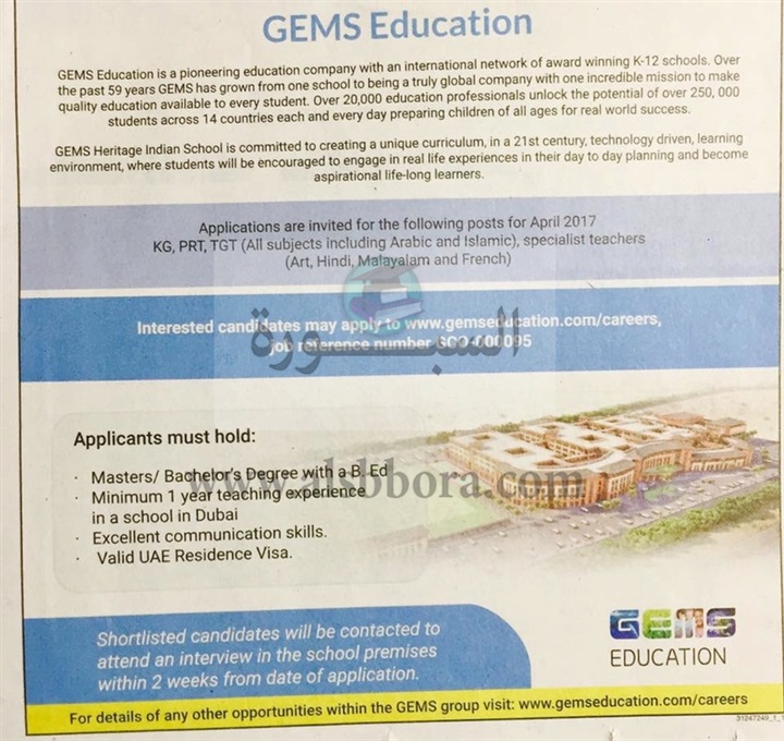 اعلنت مجموعة جيمس للتعليم بدولة الامارات العربية المتحدة عن حاجتها الى معلمين، وعلى الراغبين فى التقدم ارسال السيرة الذاتية عبر الايميل المنشور فى الاعلان التالى فى موعد اقصاه أسبوعين من تاريخ الاعلان.