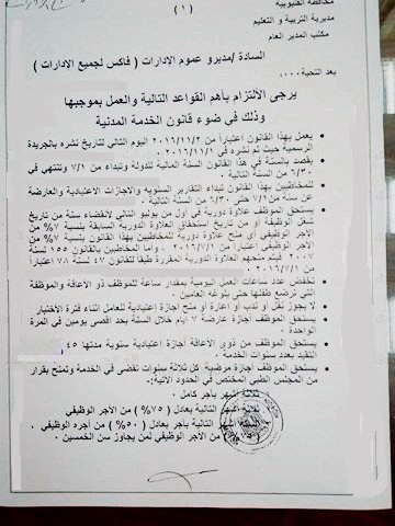 فاكس|التعليم توضح لادارات التعليمية ضوابط العمل بالمدارس بقانون الخدمة الجديد