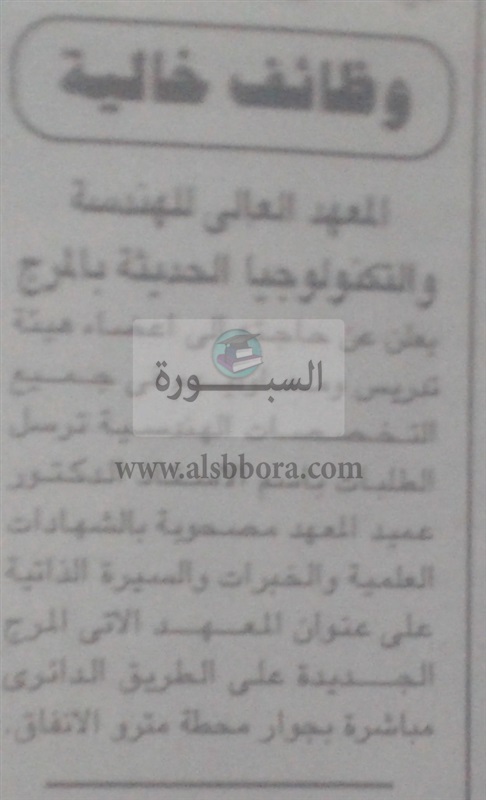 يعلن المعهد العالى للهندسة والتكنولوجيا الحديثة بالمرج عن حاجته الى أعضاء هيئة التدريس ومعاونيهم فى جميع التخصصات، وعلى الراغبين فى التقدم ارسال الطلبات باسم عميد المعهد مصحوبة بالشهادات العلمية والخبرات والسير الذاتية على عنوان المعهد.