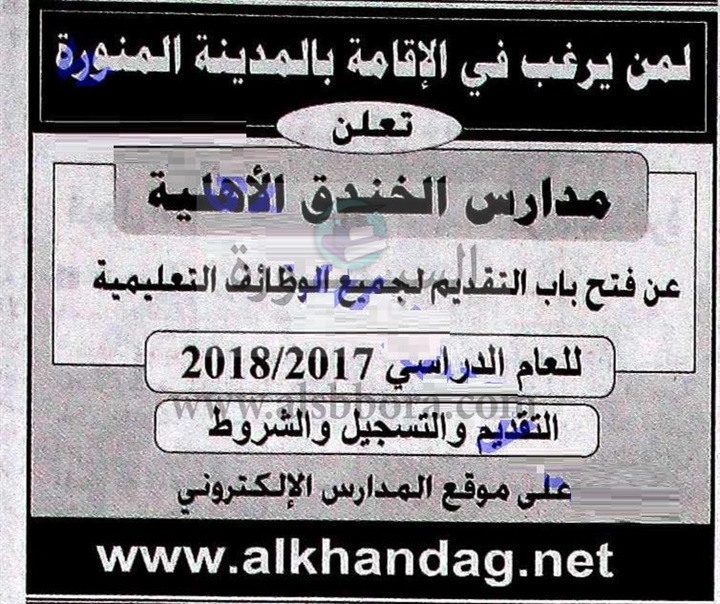 تعلن مدارس الخندق في المدينة المنورة بالسعودية عن حاجتها للتعاقد مع معلمين جدد في جميع المواد وفقا لنص الإعلان التالي: