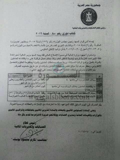 بالمستندات| المالية تعلن صرف رواتب موظفى الدولة أيام 25 لـ 28.. والحوافز والبدلات 10 من الشهر التالى