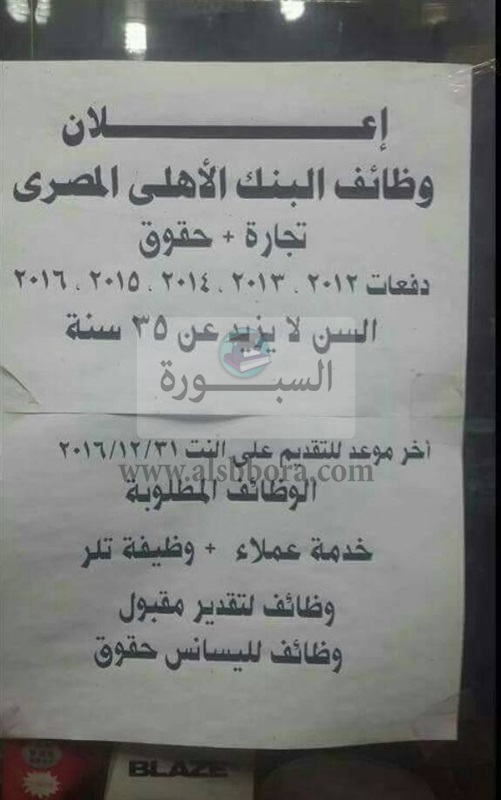 يعلن البنك الأهلى المصرى عن حاجته الى خريجى بكالوريوس التجارة وليسانس حقوق دفعات 2012،2013، 2014، 2015، 2016.
