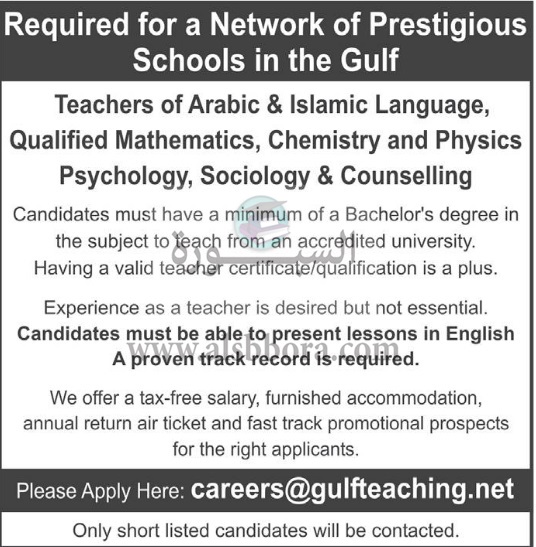 تعلن كبرى المدارس بدول الخليج عن حاجتها الى معلمين فى التخصصات التالية: معلميين لغه عربية واسلامية ورياضيات وكيمياء وفيزياء واحياء وغيرها من التخصصات الاخرى، وعلى الراغبين فى التقدم ارسال السيرة الذاتية عبر الايميل المنشور فى الاعلان التالى: