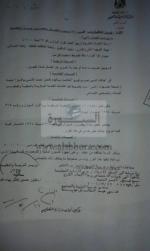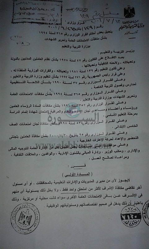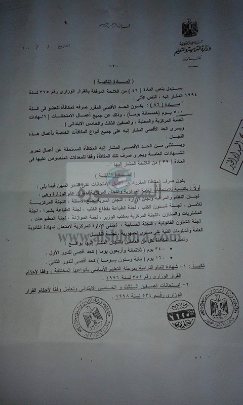 أفاد الحسين منصور الجعفرى بالآتى: "لا يجوز لمديري مديريات التربية والتعليم ومديري الادارات التعليمية بالمحافظات أو أي مسئول تقاضي مكافآة الأشراف لأكثر من امتحان واحد فقط طبقا لما ورد بالمادة الاولي من قرار السيد وزير التربية والتعليم رقم 129 لسنة 2001م بشأن تعديل بعض أحكام القرار الوزاري رقم 365 لسنة 1994م بشأن مكافأة الامتحانات العامة وتحرير الشهادات بوزارة التربية والتعليم".