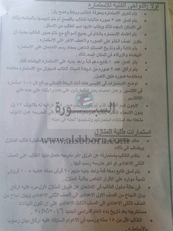 ينشر موقع السبورة التعليمات التى يجب مراعاتها لطلاب الشهادة الاعدادية عند ملئ استمارة التقدم للامتحانات فى الترم الأول والثانى للعام الدراسى 2017/2016.