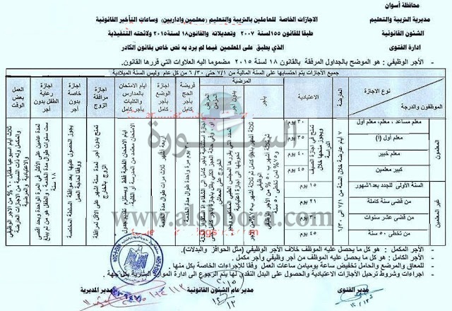 قرر الجهاز المركزى للتنظيم والادارة احتساب الاجازات فى الفترة من أول يناير الى 30 يونيه 2017 بنصف الاجازات سواء كانت الاعتيادية أو العارضة ويتم جبر الكسر لصالح المعلمين والموظفين 4 أيام عارضة.