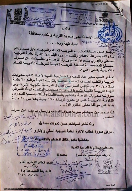 ارسلت وزارة التربية والتعليم فاكسا الى جميع المديريات التعليمية بشأن ضرورة صرف المبالغ المخصصة لسلف التربية الفنية للمرحلة الثانوية العام والتجريبية.