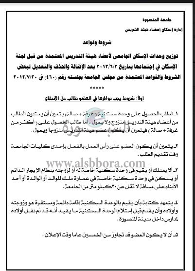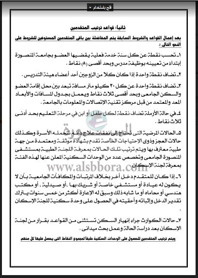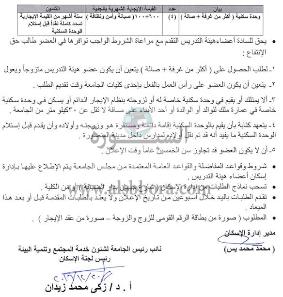 أعلنت جامعة المنصورة عن وجود 4 وحدات سكنية داخل إسكان الحرم الجامعى الخاص بأعضاء هيئة التدريس.. وننشر نص الإعلان والقواعد والشروط واستمارة ملئ البيانات.
