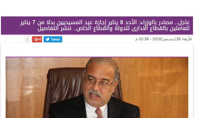 القرار الذى أصدره المهندس شريف اسماعيل باعتبار يوم السبت الموافق 7 يناير إجازة رسمية بمناسبة عيد المسيحيين لجميع العاملين بالدولة والقطاع الخاص واعتبارها إجازة مدفوعة الأجر، ويعتبر المصالح والهيئات الحكومية والقطاع الخاص والذى يحتسب بها إجازة يومى الجمعة والسبت، سوف تأخذ يوم الأحد الموافق 8 يناير بدلا من السبت إجازة مدفوعة الأجر.