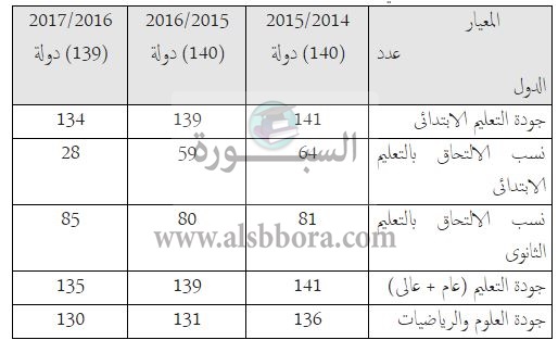 بينما جاءت نسب الالتحاق بالتعليم الابتدائى 28 لنفس العام، ونسب الالتحاق بالتعليم الثانوى 85، وجودة التعليم العالى 135، وجودة العلوم والرياضيات 130.