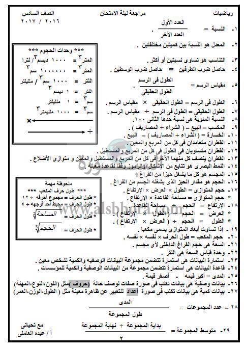 ينشر موقع السبورة ملخص قوانين الرياضيات للفصل الدراسى الأول للصف السادس الابتدائى للعام الدراسى 2017/2016.