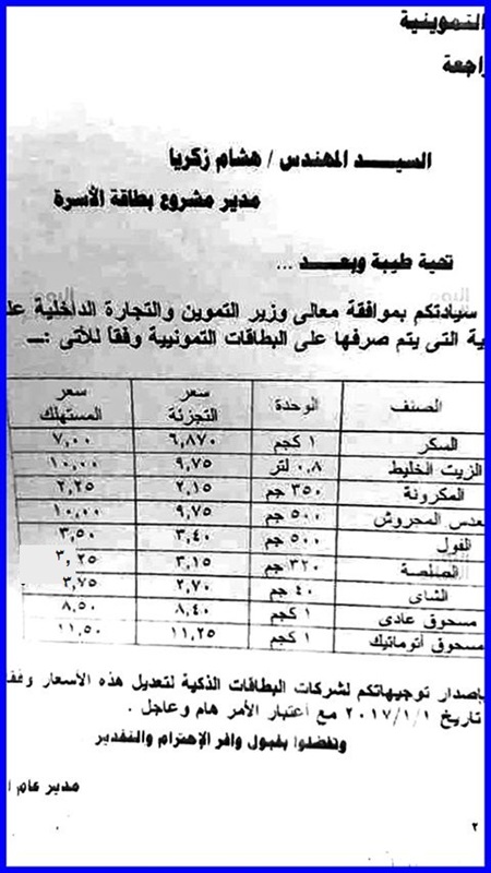 ارسلت وزارة التموين والتجارة الداخلية فاكسا الى كافة المديريات بالجمهورية لارسال تعليماتهاالى المكاتب التموينية بالمحافظات بأسعار السلع التموينية للدفع بناءا على تلك الاسعار بالبطاقة التموينية