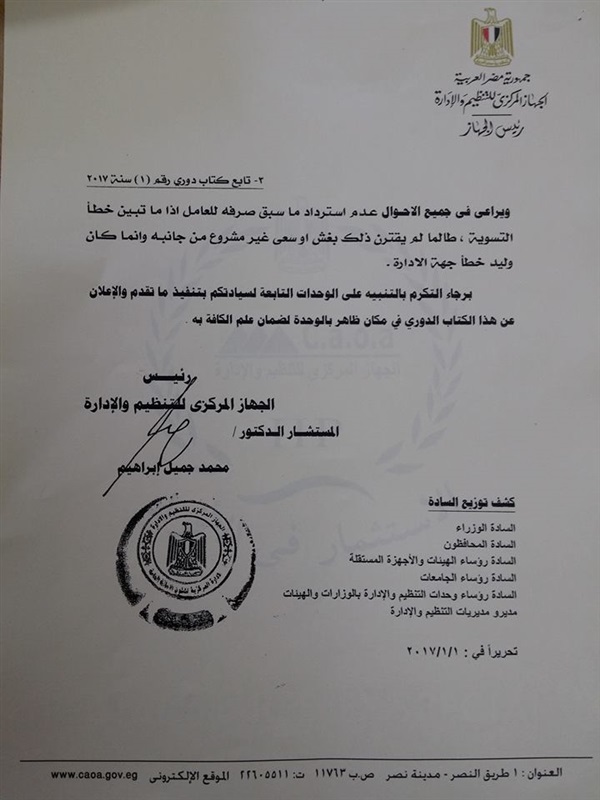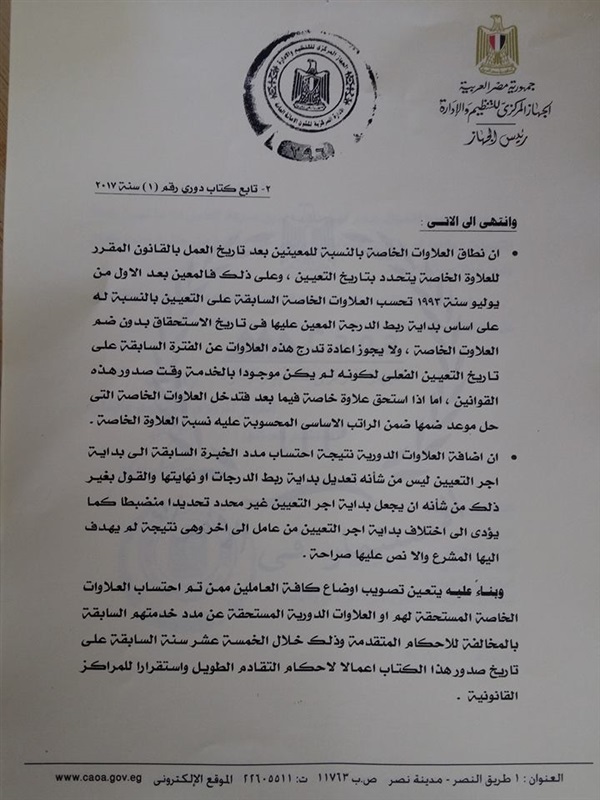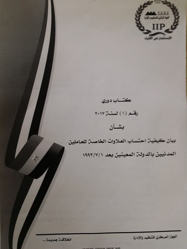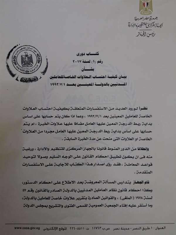 اصدر الجهاز المركزى للتنظيم والادارية الكتاب الدورى رقم 1 لسنة 2017 بشأن كيفية احتساب العلاوات الخاصة للعاملين المدنيين بالدولة للمعينين وذلك لتوضيح هل يتم حساب العلاوات على اساسى الراتب ام على مربوط الدرجة