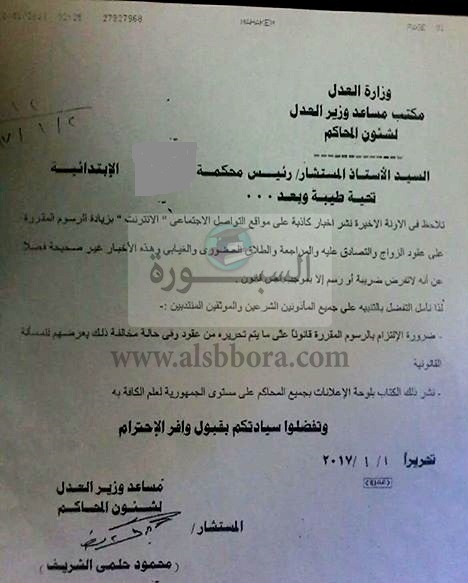 اصدرت وزارة العدل منشور رسميا لنفى زيادة رسوم عقود الزواج أوالطلاق لجميع المحاكم الابتدائية بالمحافظات .