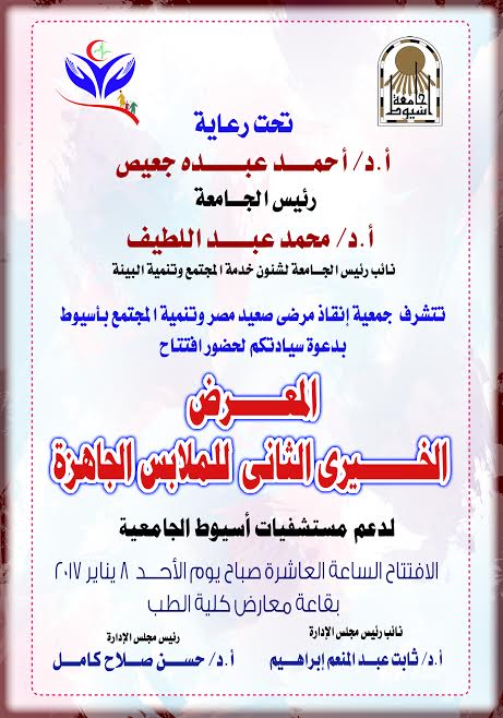 يشهد الدكتور أحمد عبده جعيص رئيس جامعة أسيوط افتتاح المعرض الخيري الثاني للملابس الجاهزة والذي تنظمه جمعية إنقاذ مرضى صعيد مصر بالجامعة أعلن ذلك الدكتور حسن صلاح نائب رئيس الجامعة السابق ورئيس مجلس إدارة الجمعية موضحاً أنه من المقرر أن يشهد الافتتاح مشاركة السادة نواب رئيس الجامعة وعمداء الكليات ومجلس إدارة الجمعية وأصدقائها من المؤسسين والمتبرعين ، مضيفاً أن المعرض هذا العام أكثر من ثلاثة الآلاف قطعة ملابس صيفية وشتوية لمختلف الأعمار والذى يهدف إلى مد يد العون للطلبة والعمال من الغير القادرين بتوفير لهم ملابس جاهزة على مستوى جيد وبأسعار رمزية ، معلناً أن دخل المعرض بالكامل سوف يتم تخصيصه لصالح دعم وتطوير مستشفيات جامعة أسيوط .