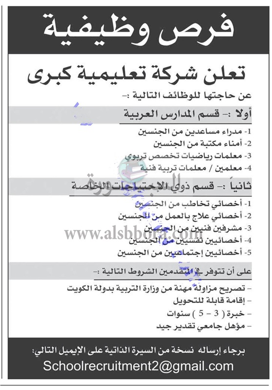 أعلنت شركة تعليمية كبيرة، بدولة الكويت ، عن حاجتها الى معلمين، وعلى الراغبين فى التقديم فى وظائف الشركة إرسال السيرة الذاتية على البريد الالكترونى المنشور فى الاعلان التالى: