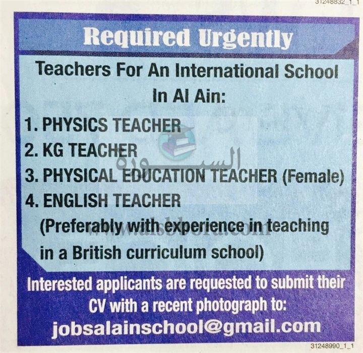 اعلنت مدرسة دولية بالعين بالامارات عن حاجتها لوظائف تعليمية منوعة للعمل بها، وعلى الراغبين فى التقدم ارسال السيرة الذاتية عبر الايميل المنشور فى الاعلان التالى: