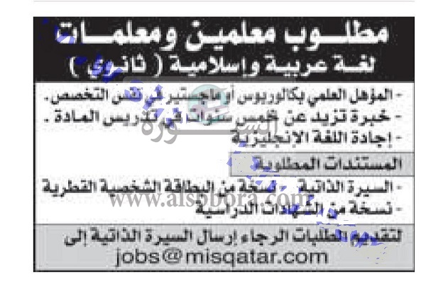 تعلن مدرسة خاصة في دولة قطر عن وظائف جديدة للمعلمين وذلك وفقا لنص الإعلان التالي: