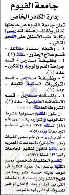 أعلنت جامعة الفيوم عن وظائف جديدة لأعضاء هيئة التدريس"من معيد الي أستاذ" علي أن يكون أخر موعد للتقديم الأحد 8 يناير وفقا لنص الإعلان التالي: