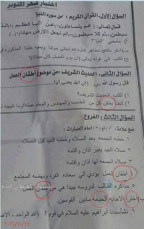 قامت صفحة حقى فين على موقع التواصل الاجتماعى "فيسبوك" بنشر صورة لأسئلة امتحان شهر أكتوبر فى مادة الدين وبه عدة أخطاء لغوية حيث ذكر كلمة اتقان بحرف الطاء هكذا اطقان، وعلق العديد من رواد فيس بوك على هذه الصورة بالتالى: