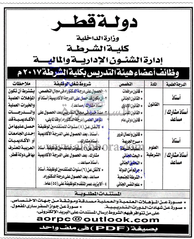 تعلن وزارة الداخلية بدولة قطر عن حاجتها الى أعضاء هيئة التدريس بكلية الشرطة، وعلى الراغبين فى التقدم ارسال السيرة الذاتية على الايميل المنشور بجريدة أخبار اليوم 7 يناير 2017.