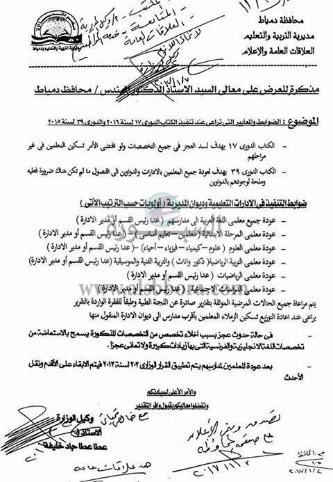 ينشر موقع السبورة فاكسا خاصا بشأن عودة جميع المعلمين المنتدبين فى اماكن ادارية بمديرية التربية والتعليم بمحافظة دمياط الى اماكنهم بالمدارس ما عدا رئيس القسم ومدير الادارة، وذلك لسد العجز للمعلمين بالمدارس.